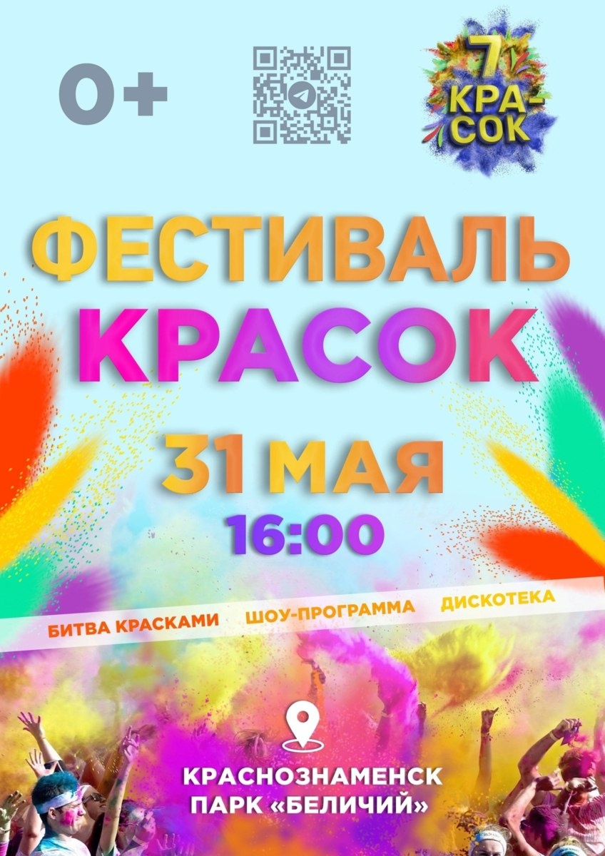 31 мая, 16:00 — Беличий Парк г. Краснознаменск Грандиозный, яркий, незабываемый: фестиваль красок #7красок уже совсем близко! В программе — жаркие танцы под любимые хиты,