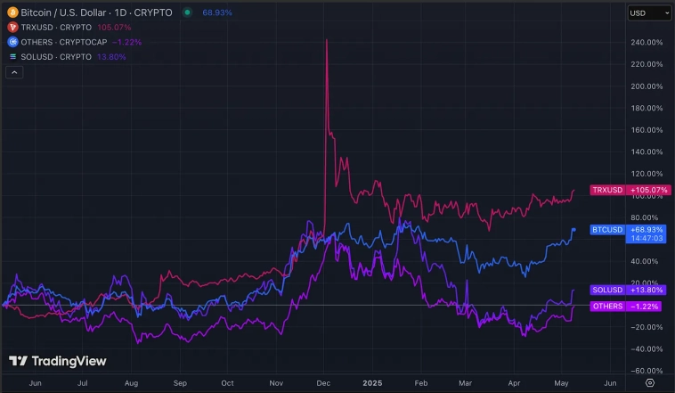 Перед тем как вы погрузитесь в изучение статьи, обратите внимание на тот факт что всё упомянутое в ней не является финансовой рекомендацией для принятие более взвешенного решения просьба провести свое собственное исследование. ________________________________________________________________________ • Факторы спроса: комиссии за газ, стейкинг, управление • Факторы предложения: выпуск новых токенов • Ключевой катализатор: прокси на рост стейблкоинов • Ключевые риски: депег стейблкоинов, падение ликвидности Пока рынок гонялся за мемами, TRX тихо захватил доминирующее положение в сфере стейблкоинов. Сейчас он лидирует по объему переводов в стейблах благодаря низким комиссиям, скорости и надежности. Результат? TRX растет на +105% по сравнению с прошлым годом, опережая BTC и majors в качестве скрытой “stable” altcoin play. TRX владеет 30,8% всех стейблкоинов, уступая лишь ETH, и почти сравнялся с ETH по объему USDT ($71,7B против $74,5B). Рост объема стейблкоинов +$13,3B опережает ETH и SOL,