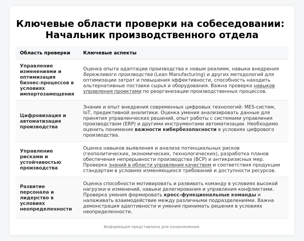 Подготовьтесь к ответам на типичные вопросы для начальника производственного отдела (управление командой, оптимизация производственных процессов, решение проблем).