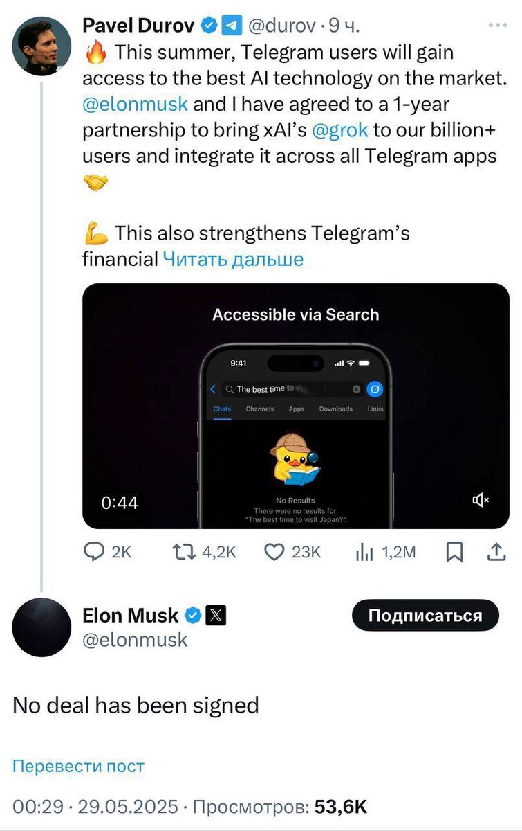 Пока без Grok в Telegram.. 😂 ❌ Илон Маск заявил, что никакой сделки между xAI и Telegram по интеграции чат-бота Grok не заключалось. Это заявление прозвучало после сообщений СМИ о якобы достигнутой договорённости. 🗣 Позже Павел Дуров подтвердил: переговоры действительно были, стороны «в целом договорились», но официально никаких документов не подписано.