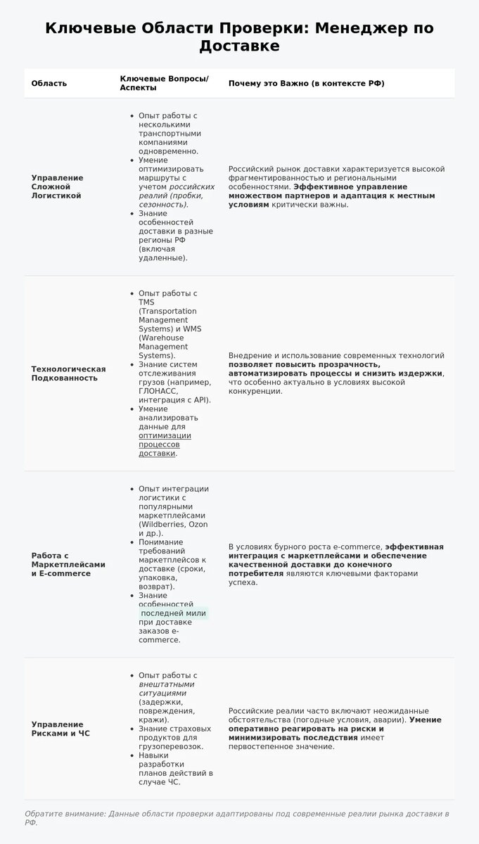 - Опыт управления доставкой: Оценивается опыт планирования маршрутов, управления курьерами, решения проблемных ситуаций (например, задержки, повреждения).