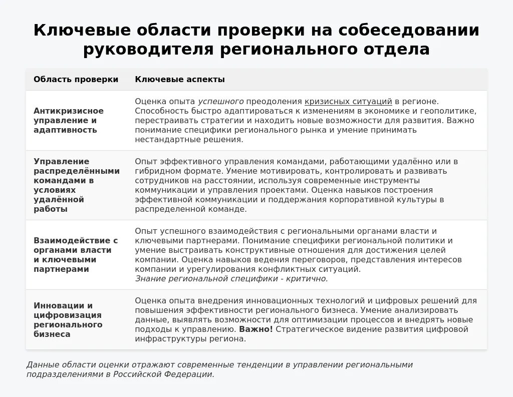 Работодатели при оценке кандидатов на позицию руководителя регионального отдела уделяют внимание следующим ключевым областям: