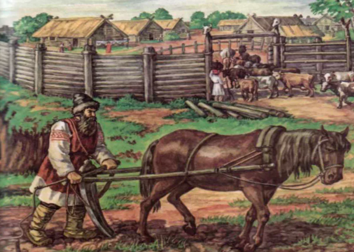 Исторический факт: В X веке на Руси сочетались подсечно-огневое земледелие и пашенное. Под Новгородом, где почвы были плодороднее, использовали соху, запряжённую волами. Основными культурами были рожь, ячмень, овёс и репа. Община (вервь) регулировала распределение земли и решала споры, что обеспечивало выживание деревни.