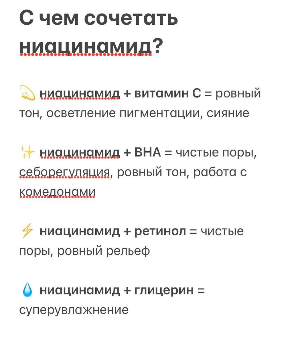 С чем хорошо сочетается ниацинамид? Тут речь как о послойном нанесении средств, так и о ситуации, когда два актива производитель добавил в одну банку. #ниацинамид