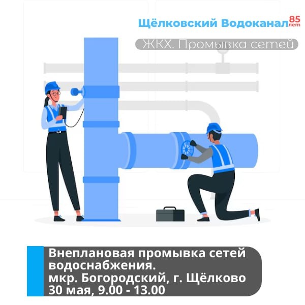 Внеплановая промывка сетей холодного водоснабжения в микрорайоне Богородский Щёлкова 30 мая, с 9.00 до 13.00 водоканал будет проводить внеплановую промывку межплощадочных сетей холодного водоснабжения к домам: Богородский 10к1, 10к2, 15, 16, 17, 19, 21, 22, 23. Управляющим компаниям Домжилсервис, УК Эдельвейс, ТСЖ Богородский, 2 рекомендовано перекрыть водопроводные ввода, в связи с чем водоснабжение в указанных домах с 9.00 до 13.00 будет отсутствовать. Также в это же возможно ухудшение параметров воды в домах мкр. Богородский, 1, 2, 3, 5, 6, 7, 8. Напомним, что на водопроводно-насосной станции №6 ведется реконструкция, в связи с чем возможно кратковременное ухудшение параметров водоснабжения в мкр. Богородский. Приносим извинения за доставленные неудобства. Телефон аварийно-диспетчерской службы водоканала: 8-49656-21172. Подписаться | Сайт | Поддержка | Вакансии