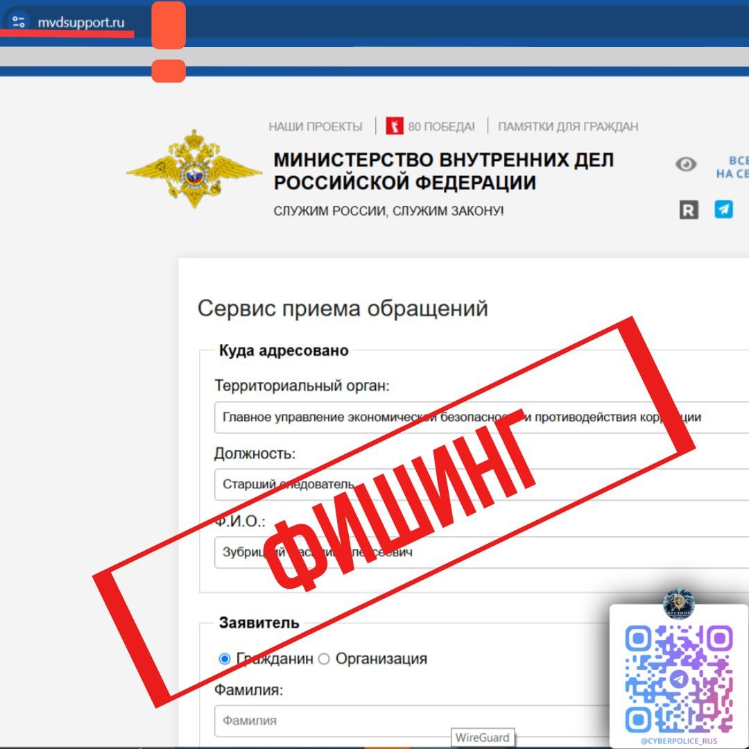 МВД предупреждает: в сети обнаружен поддельный сайт, имитирующий официальный портал ведомства. Цель — сбор персональных данных через форму «приема обращений». Ресурс уже направлен на блокировку, но возможно появление новых копий.