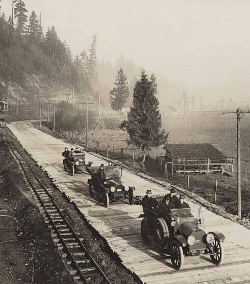 Тихоокеанское шоссе, официальное открытие которого состоялось 29 января 1915 года, стало важным этапом в развитии автомобильного сообщения между западной частью Соединенных Штатов и Канадой. В начале XX века, когда всё большее количество людей начинало путешествовать на автомобилях, автомобильные клубы Вашингтона, Орегона, Калифорнии и Британской Колумбии объединились, сформировав Тихоокеанскую ассоциацию автомобильных дорог. Целью ассоциации было создание маршрута Север-Юг, используя существующие дороги, что позволило бы путешественникам передвигаться вдоль Тихоокеанского побережья. Несмотря на то, что дорога была официально обозначена, значительная её часть оставалась грунтовой, особенно за пределами крупных городов, что делало путешествия сложными и полными приключений. На фотографии, сделанной к югу от Сиэтла в 1915 году, изображены автомобилисты из Такомы, проезжающие по недавно открытому Тихоокеанскому шоссе. Фотография подчеркивает не только растущую популярность автомобилей, н