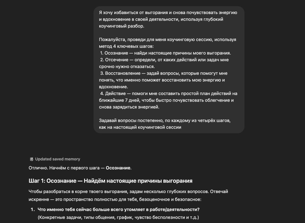 🔥 **Как ChatGPT спасает от выгорания?** Если чувствуете, что больше не тянете и работа вызывает только раздражение — не беда. Мы нашли крутой способ использовать ChatGPT, чтобы вернуть энергию и вдохновение! 🚀 "ChatGPT проведёт для вас коучинговую сессию", помогая разобраться в настоящих причинах выгорания и составить план спасения. Всё, что нужно — ввести этот мощный промт: 💡 **Хочу избавиться от выгорания и снова почувствовать энергию. Проведи для меня коучинговую сессию, используя 4 ключевых шага:** 1️⃣ **Осознание** — найди причину моего выгорания. 2️⃣ **Отсечение** — определи, от чего нужно отказаться. 3️⃣ **Восстановление** — задай вопросы, чтобы понять, что вернёт мне энергию. 4️⃣ **Действие** — предложи план на 7 дней для перезагрузки. ChatGPT будет задавать вопросы пошагово, как настоящий коуч, помогая разобраться в себе и вернуть мотивацию. 🧠✨ Попробуйте сами — результат вас удивит! 🙌 #выгорание #мотивация #коучинг #нейросети #ChatGPT