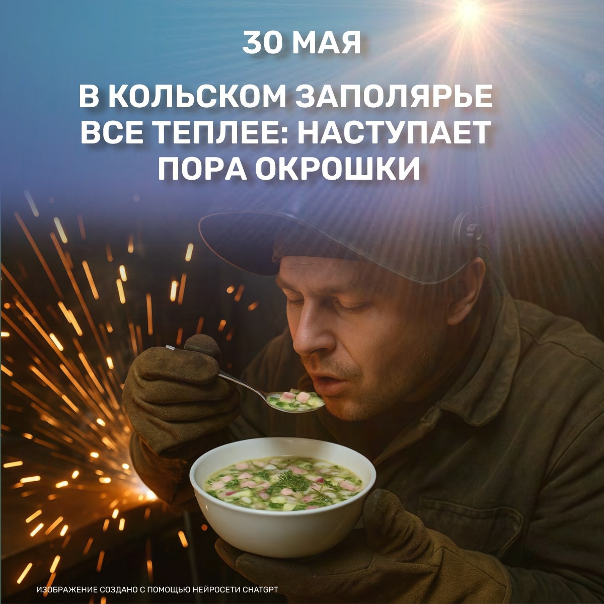 ☀ В Мурманской области 30 мая, в День окрошки и День сварщика, ожидается облачная с прояснениями погода. Временами дождь. Ветер северный, северо-западный умеренный. Температура воздуха ночью от +6 до +11 градусов Цельсия, днем +12… +17. ✨ 30 мая отмечается День окрошки. Существует легенда, что окрошку придумали бурлаки, трудившиеся на Волге. За работу им выдавали квас и жесткую сушеную рыбу. Бурлаки замачивали рыбу в квасе, чтобы размочить. В похлебку также добавляли овощи и зелень. 💥 А еще 30 мая свой профессиональный праздник отмечают сварщики. Многие из нас с детства помнят, что смотреть на сварку нельзя. Знаете, почему? Зрению может повредить не яркий свет и искры, а ультрафиолетовое излучение, которое не воспринимается человеческим зрением, но способно воздействовать на слизистую, роговицу, сетчатку и хрусталик глаза.