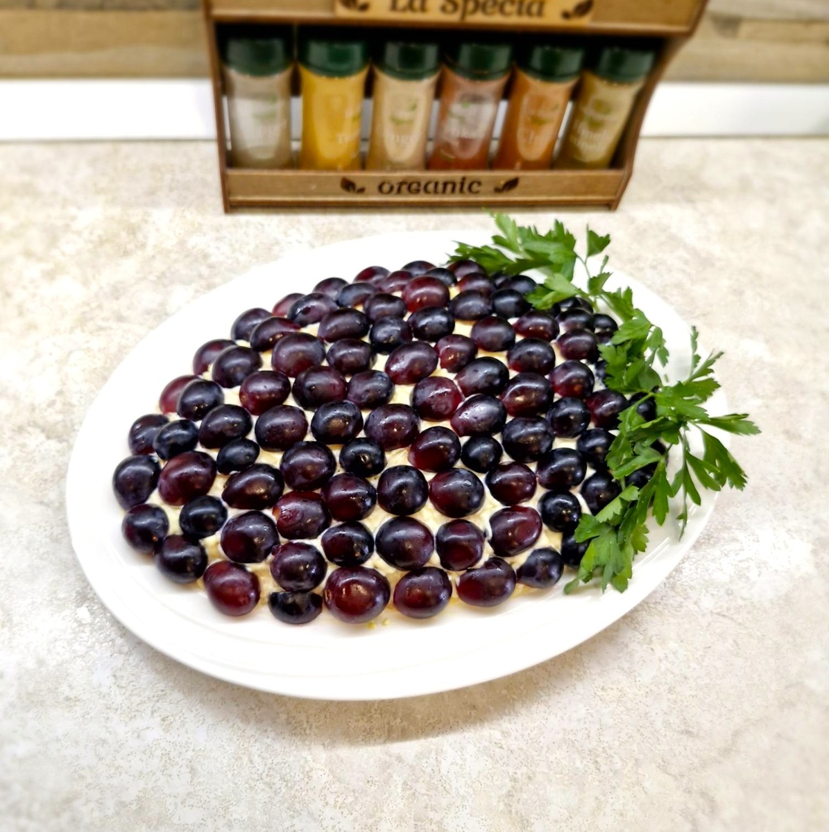 Очень нежный и вкусный салат, который приятно удивит ваших гостей не только интересным внешним видом, но и вкусом. Особенно понравится тем, кто любит сочетание соленого сыра с сочным сладким виноградом. Форма виноградной грозди придает салату особую оригинальность и праздничность и обязательно привлечет внимание всех собравшихся за столом! Несмотря на замысловатую форму, готовится он достаточно быстро и просто. Для приготовления нам понадобится: Яйца очищаем от скорлупы и отделяем белки от желтков. Куриную грудку очищаем от кожуры и костей и нарезаем мелкими кубиками. Сыр натираем на крупной терке и смешиваем с чесноком, пропущенным через пресс. Виноград тщательно моем и нарезаем на половинки. Затем выкладываем всё слоями на блюдо, стараясь придать салату форму виноградной грозди: Затем отправляем салат в холодильник минимум на час. Перед подачей дополняем нашу виноградную гроздь веточками петрушки. Вот такой оригинальный и вкусный салат получился! Приятного аппетита и до новых рецепт