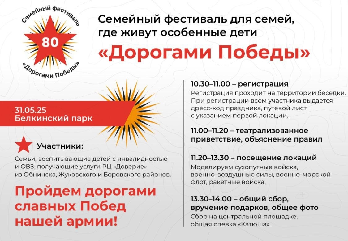 31 мая в 11:00 в парке «Усадьба Белкино» пройдёт традиционный семейный фестиваль «Forest games» ко Дню защиты детей. В этом году фестиваль посвящен 80-летию Победы. Организаторы – детский реабилитационный центр «Доверие» и Центр «Эврика». Для семей с особенными детьми. Для участия в программе фестиваля нужно зарегистрироваться перед началом на летней эстраде с 10:30 до 11:00. Вход свободный. 👍 Подписаться | Прислать мероприятие
