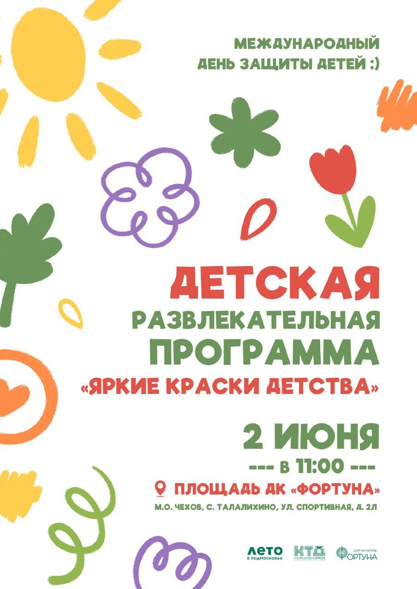 ✨ Развлекательная программа «Яркие краски детства» в с. Талалихино 🥰💥Ребят ждёт танцевальный флешмоб, яркие выступления участников кружков «Солнышко», «Творческая Бригада», «Калинка», игры и конкурсы на ловкость и находчивость, быстроту и сообразительность. 🚫 Возраст: 0+ 📆 02.06.2025 🕛 11:00 🏢 ДК «Фортуна» 📍 г.о. Чехов, с. Талалихино, ул. Спортивная, д.20 🪙 Вход свободный❗️ #webЧехов ⭐Разместить публикацию ⭐Поддержать канал голосом ✅ Мероприятия Чехов https://dzen.ru/id/66cc4b48e9ef144699238a51 http://vk.com/chekhov_events http://dzen.ru/chekhov_events
