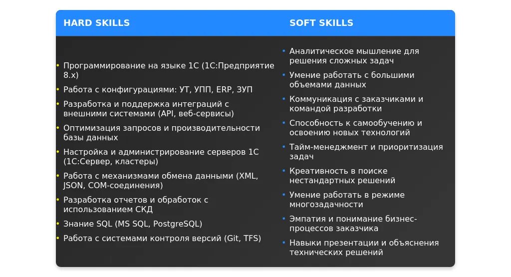На что делать акцент: базовые навыки работы с 1С, знание платформы, аналитические способности, обучаемость.