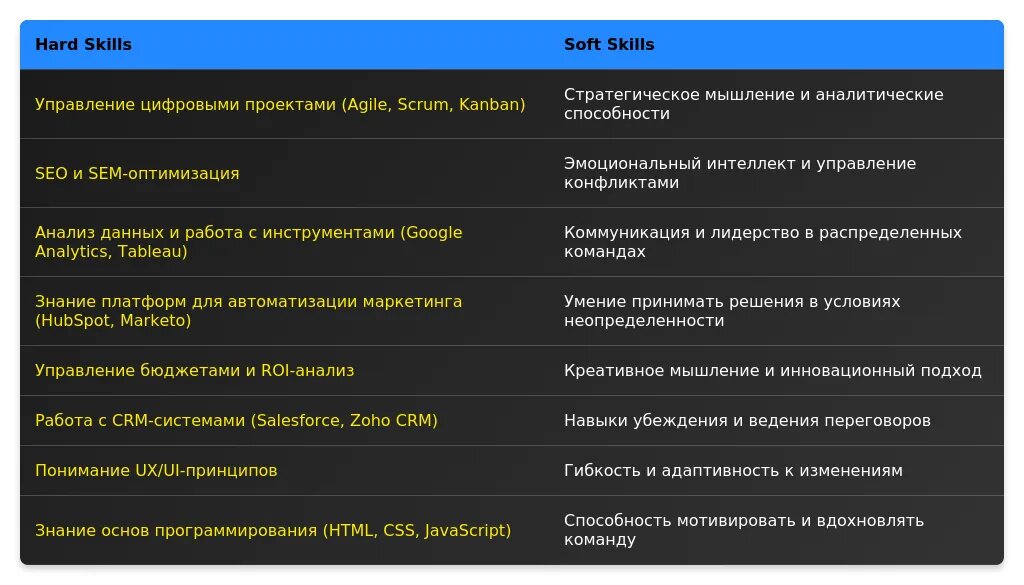 При анализе вакансии важно выделить ключевые требования, разделяя их на обязательные и желательные. Обращайте внимание на конкретные навыки, такие как опыт управления командой, знание инструментов интернет-маркетинга (например, Google Analytics, Яндекс.Метрика), а также на требования к личным качествам, например, лидерство, стратегическое мышление. Обязательные требования обычно указаны явно, например, "опыт работы от 3 лет в digital-маркетинге". Желательные требования могут быть скрыты в описании компании или в разделе "Мы предлагаем". Например, если в вакансии упоминается "работа в динамичной среде", это может сигнализировать о необходимости адаптивности и стрессоустойчивости.