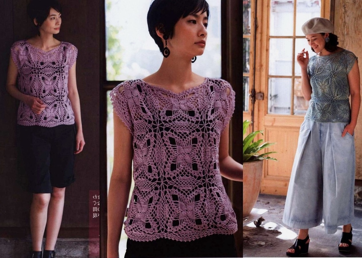 Большие дырки получаются благодаря провязывания двойного накида. Невероятно красивый сложносочинённый узор выполненный крючком в хлопковом пуловере с длинным рукавом и полуоткрытой круглой горловиной. В прохладный летний вечер, на
