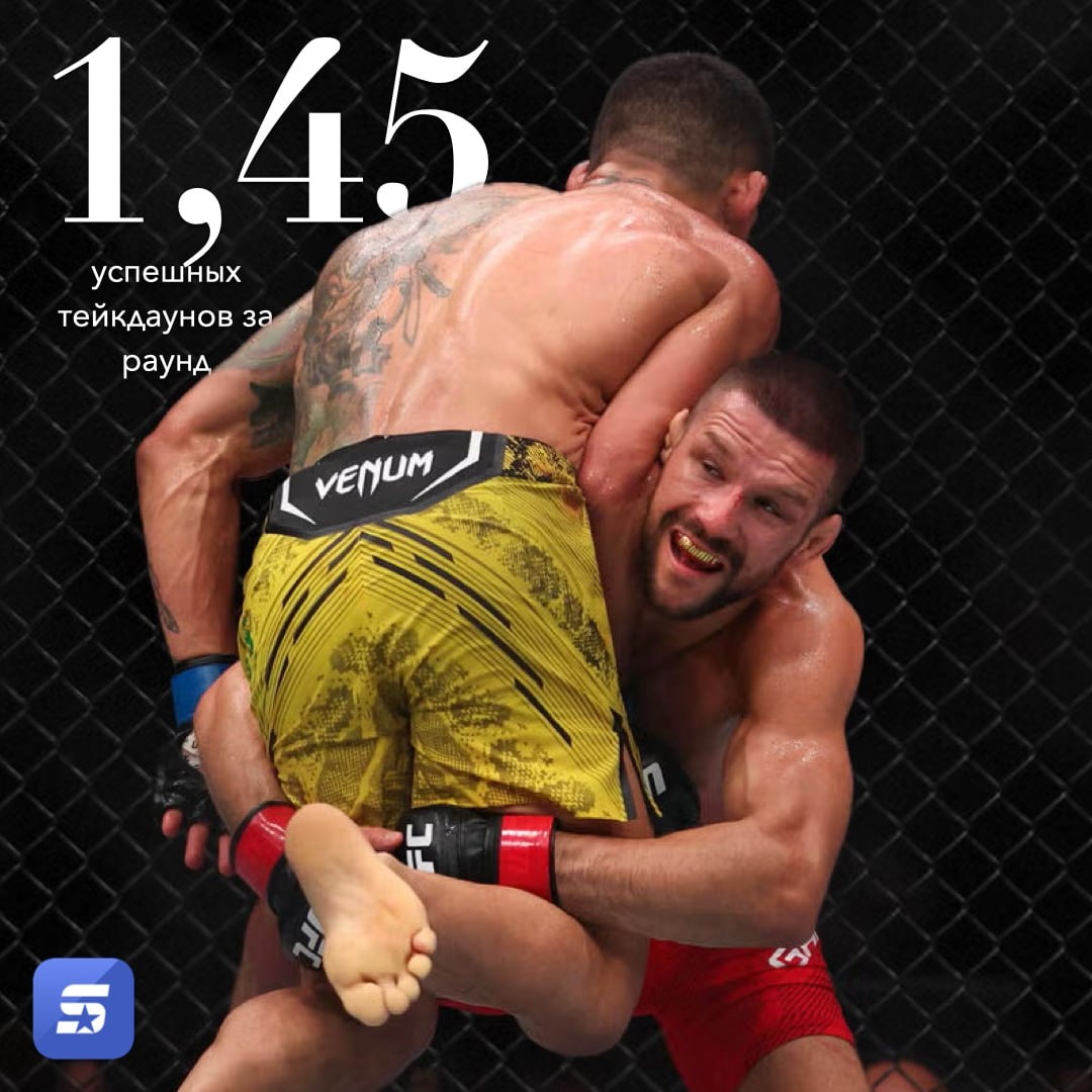 🇵🇱 Матеуш Гамрот — король тейкдаунов на #UFCVegas107 Среди всех участников карда он чаще других уводит бой в партер — в среднем 1,45 успешных тейкдауна за раунд. 🧠🤼♂️ Сколько раз Матуеш в эти выходные отправит Людовита Клайна в партер?