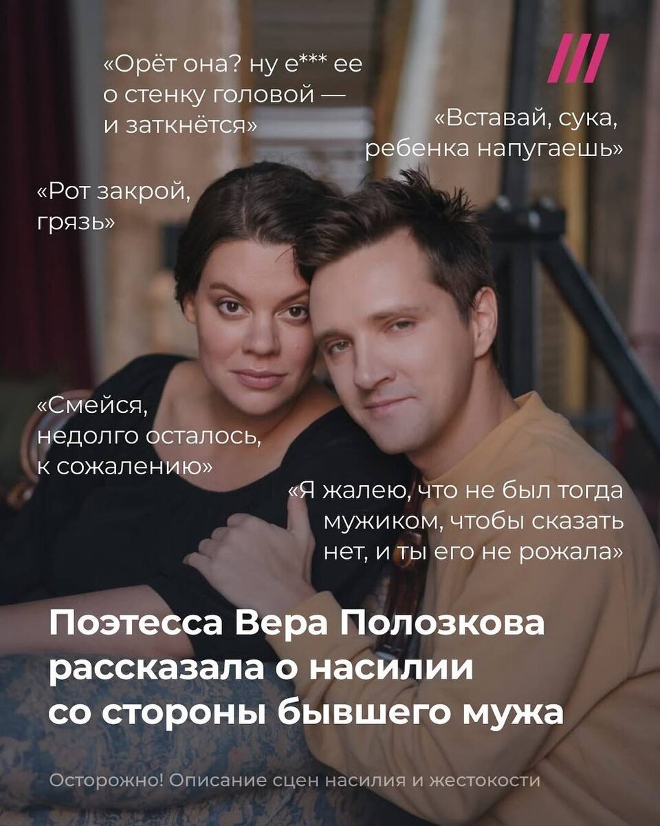 Пришло время трогательных историй от подзабытых иноагентов. Поэт и экстремист, внесенная в список иноагентов Вера Полозкова пожаловалась "свободной" западной аудитории на экс-супруга абьюзера. По словам Веры, она готова была покончить с собой из-за слов и действий своего бывшего супруга, отца двух ее сыновей Федора и Саввы и музыканта ее же группы Александра Бганцева. По словам иноагента Веры Полозковой, Александр унижал ее и требовал прервать беременности. Певица поделилась в соцсетях шокирующими фразами, которые слышала от Александра. «Я жалею, что не был тогда мужиком, чтобы сказать нет, и ты его не рожала», «Смейся, недолго осталось, к сожалению», «Лучше бы что-то полезное из роддома привезла», «Дети были твоей идеей, Вер. Я должен был уйти еще до Федяна», «Когда ты на аборт?», «Орет она? Ну ударь ее о стенку головой, и заткнется» (дочери был месяц, у нее были колики)», — по словам поэтессы, мечтающей об убийстве коллеги, оскорблял ее Бганцев. По словам же Веры, никто из друзей п