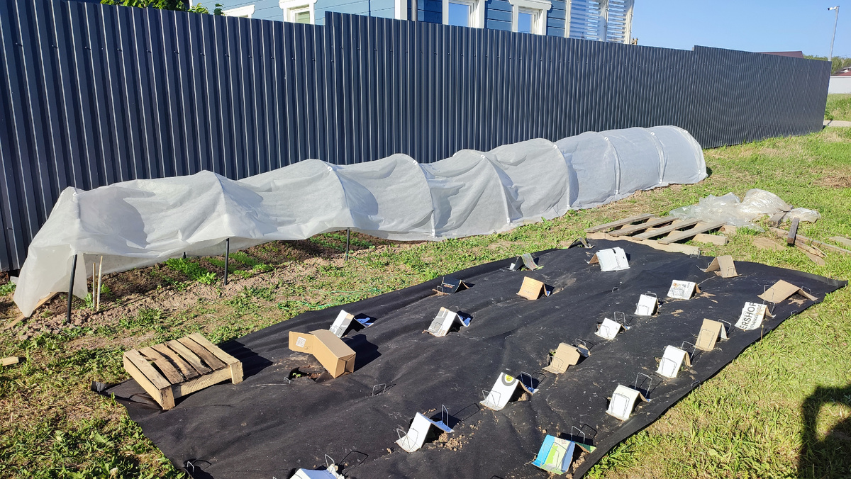Временами я уходила в тень, чтобы делать «картонные домики», которые первое время будут прикрывать рассаду от солнца.