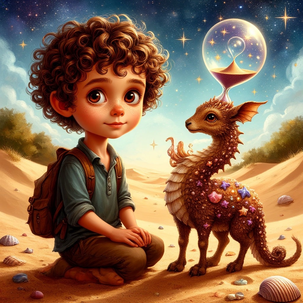 После прощания с Брисом и говорящей мельницей, Луми шёл долго. Ветер больше не был его спутником, он исчез, оставив за собой тишину. На горизонте раскинулась огромная равнина цвета тёплого золота. Это была Песчаная равнина - бескрайняя, тихая и полная тайных шорохов. Луми снял обувь. Тёплый песок приятно щекотал ступни. Вокруг было почти безмолвно, лишь изредка песчинки перекатывались с места на место: “шшш... шшш...” — Здесь что-то прячется, - шепнул Луми сам себе. Он присел и стал всматриваться в узоры на песке. И вдруг : “тик-так, тик-так” - что-то замелькало! Маленький круглый зверёк с часиками на спинке выскочил из-под песка. — Привет! - пискнул он. — Я Тик. А ты кто? — Я Луми. А что у тебя на спинке? — Это мои песочные часы. Я храню время этой равнины! - гордо сказал Тик. Оказалось, в Песчаной равнине всё живёт по-другому: не по минутам и часам, а по ветру, солнцу и звукам. Если солнце высоко- это время учиться. Если шорох в песке - время играть. Если небо розовеет -пора слушат