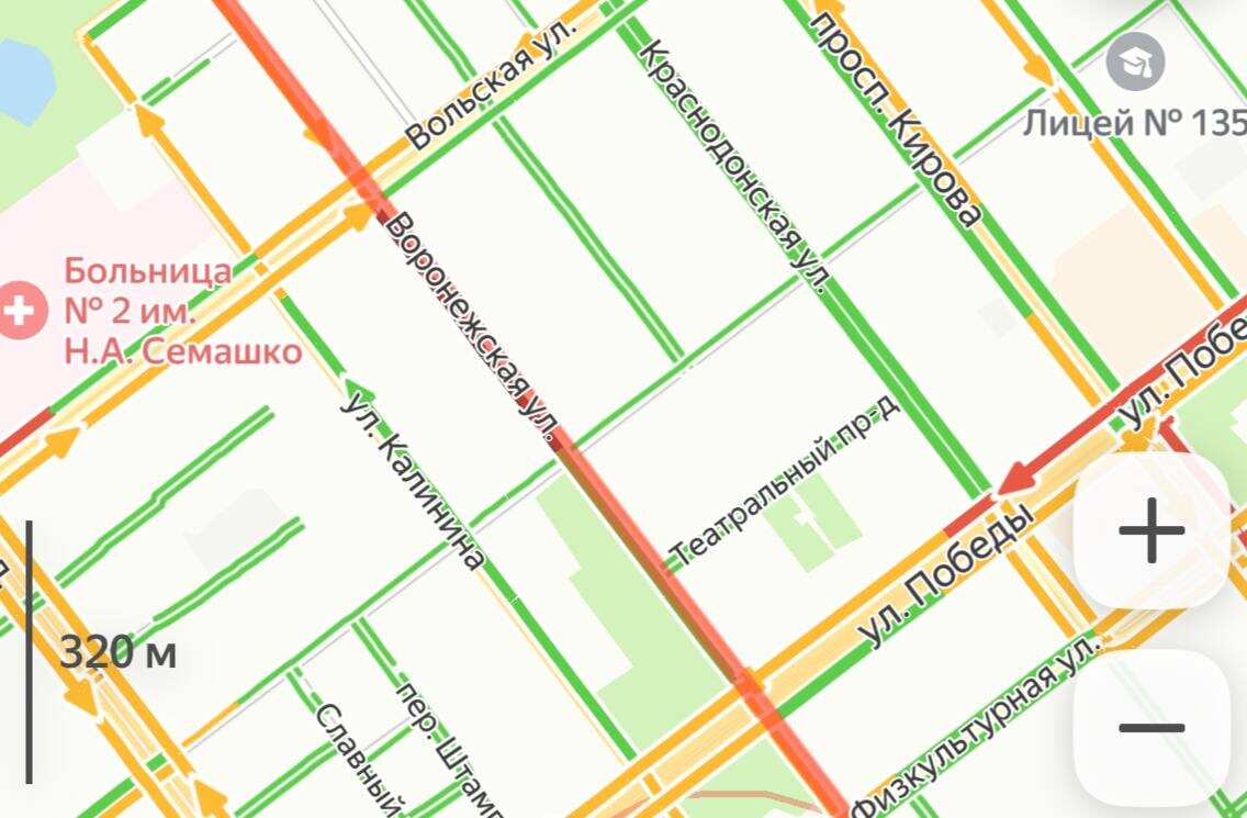 ❗️❗️❗️❗️❗️❗️В Самаре перекрыто движение по улице Воронежской Причиной временных ограничений, по словам очевидцев, стало возгорание гаража по адресу Воронежская, 25. Пожарные перекрыли участок дороги от улицы Вольской в направление улицы Победы. Автобусы №6,8, 21,38 будут следовать по следующему маршруту: по ул.Вольской - ул.Ново-Вокзальная - ул.Победы и далее по маршруту в направлении проспекта Кирова. 📸: Яндекс Карты