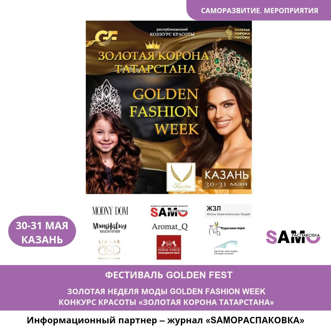 🌟 Наш журнал «SAMOРАСПАКОВКА» выступает информационным партнером фестиваля GOLDEN FEST, который является мегапроектом официального всероссийского запатентованного бренда с государственной регистрацией 👑 «ЗОЛОТАЯ КОРОНА РОССИИ»! В рамках фестиваля пройдет Золотая неделя моды GOLDEN FASHION WEEK, бизнес-премия «Успешные люди России» по мнению бренда «ЗОЛОТАЯ КОРОНА РОССИИ» и Конкурс Красоты «ЗОЛОТАЯ КОРОНА ТАТАРСТАНА». Это грандиозное событие пройдет 30-31 мая 2025 года в самом сердце Казани на главном подиуме республики в гостиничном торгово-развлекательном комплексе (ГТРК) «Корстон-Казань» и обещает стать одним из самых ярких и стильных fashion-событий года! 🎉 Золотая неделя моды GOLDEN FASHION WEEK – это показ более 20 новых коллекции от талантливых брендов и дизайнеров России. Это масштабное событие, полное погружение в мир красоты и стиля, большая сцена и подиум. Сотни гостей и участников, звезды, представители СМИ и телевидения, и невероятная режиссура сделают этот день самым я
