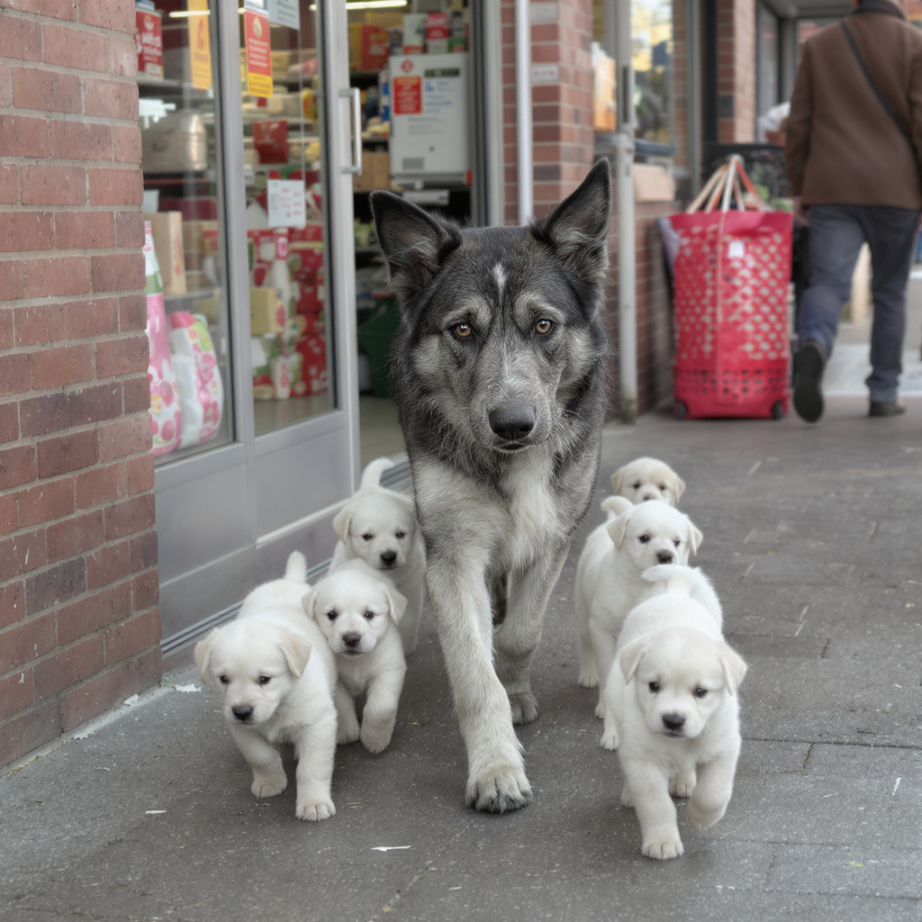 Пёс остановился у служебного входа. Поднял лапу — щенки замерли. Опустил — малыши присели. Через минуту из двери вышла продавщица с пакетом объедков. Старик подождал, пока женщина уйдёт, и только тогда подвёл стаю к еде.
