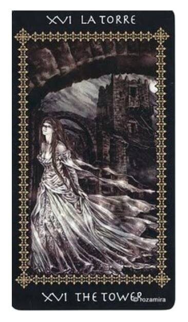 Но наша колода из мира теней, а значит, здесь девствуют свои законы. Поэтому Башня отражается во всей красе – если присмотреться, то девушка, изображенная на переднем плане, исполнена решимости. И лицо ее освещено улыбкой. Кажется, что она сейчас так и скажет: «Уф, наконец-то я от всего этого избавилась. Как же хорошо, как легко сразу стало. Теперь ничто и никто не держит меня! Я сбросила оковы, я свободна!» Девушка так стремительно покидает башню (уж не место ли своего заключения?), что складывается впечатление, будто она даже что-то натворила перед своим уходом (я даже первое время присматривалась к башне, выискивая в ней повреждения).