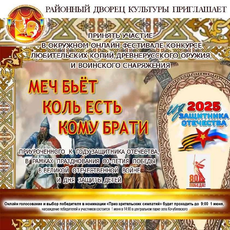 https://xn--90agqcrnt5a.xn--p1ai/news/2025/05/27003/ ✨✨✨Онлайн-фестиваль-конкурс «Меч бьет, коль есть кому брати» посвящен дню славянской письменности и культуры. В рамках этого мероприятия любители создают копии древнерусского оружия и военного снаряжения.✨✨✨ 🌞Цель конкурса — пробудить интерес к отечественной истории и культуре, дать возможность участникам выразить себя через творчество.🌞 🌺🌺🌺Приглашаем всех желающих проголосовать за понравившегося участника. Для этого перейдите по ссылке.🌺🌺🌺 ⭐️⭐️⭐️Оргкомитет определит победителей по итогам голосования. Все фотографии размещены на сайте кочубрдк.рф, где можно отдать свой голос в номинации «Приз зрительских симпатий».⭐️⭐️⭐️ 🌱Голосование проходит с 29 по 30 мая до 9:00. Подведение итогов и награждение состоятся 1 июня в центральном парке села Кочубеевского в День защиты детей.🌱