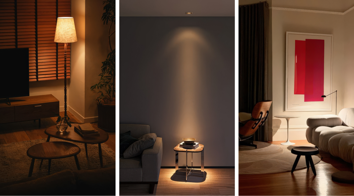 Представьте три сценария освещения, созданные в одной и той же комнате. В первой — мягкий, тёплый свет «растворяет» углы и наполняет пространство ощущением уюта. Во второй — акцентная подсветка выделяет винтажный предмет, оставляя остальную часть комнаты в лёгкой тени. В третьей —направленный поток скользит по линии дивана, подчеркивая изгибы и тактильность обивки. Мебель и отделка остаются прежними, но ощущения — совершенно разные.