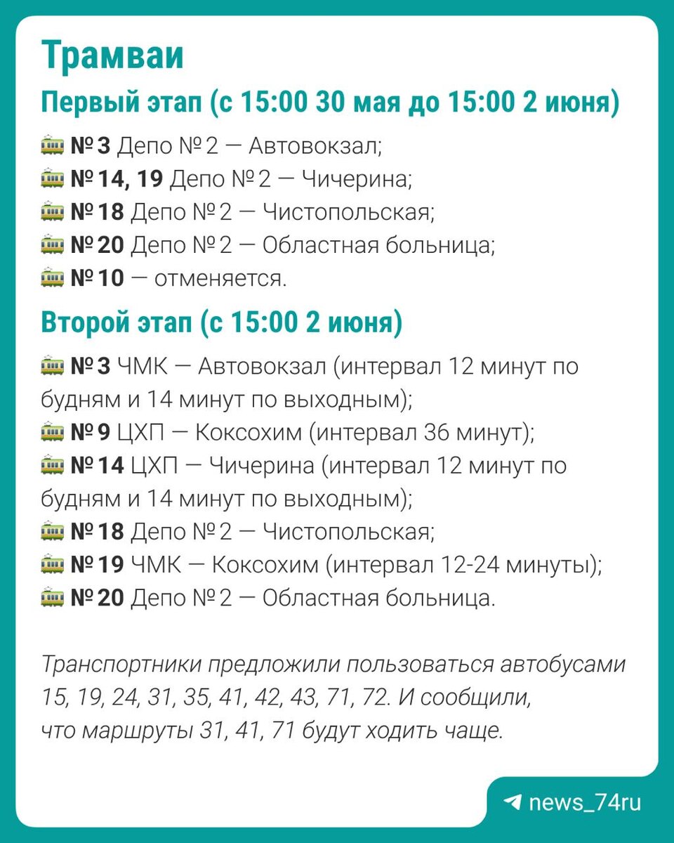 Из-за ремонтов на ЧМЗ изменятся маршруты общественного транспорта ⬆️ Трамваи пойдут по другому пути из-за обновления моста через реку Миасс, автобусы — из-за работ на Шоссе Металлургов.