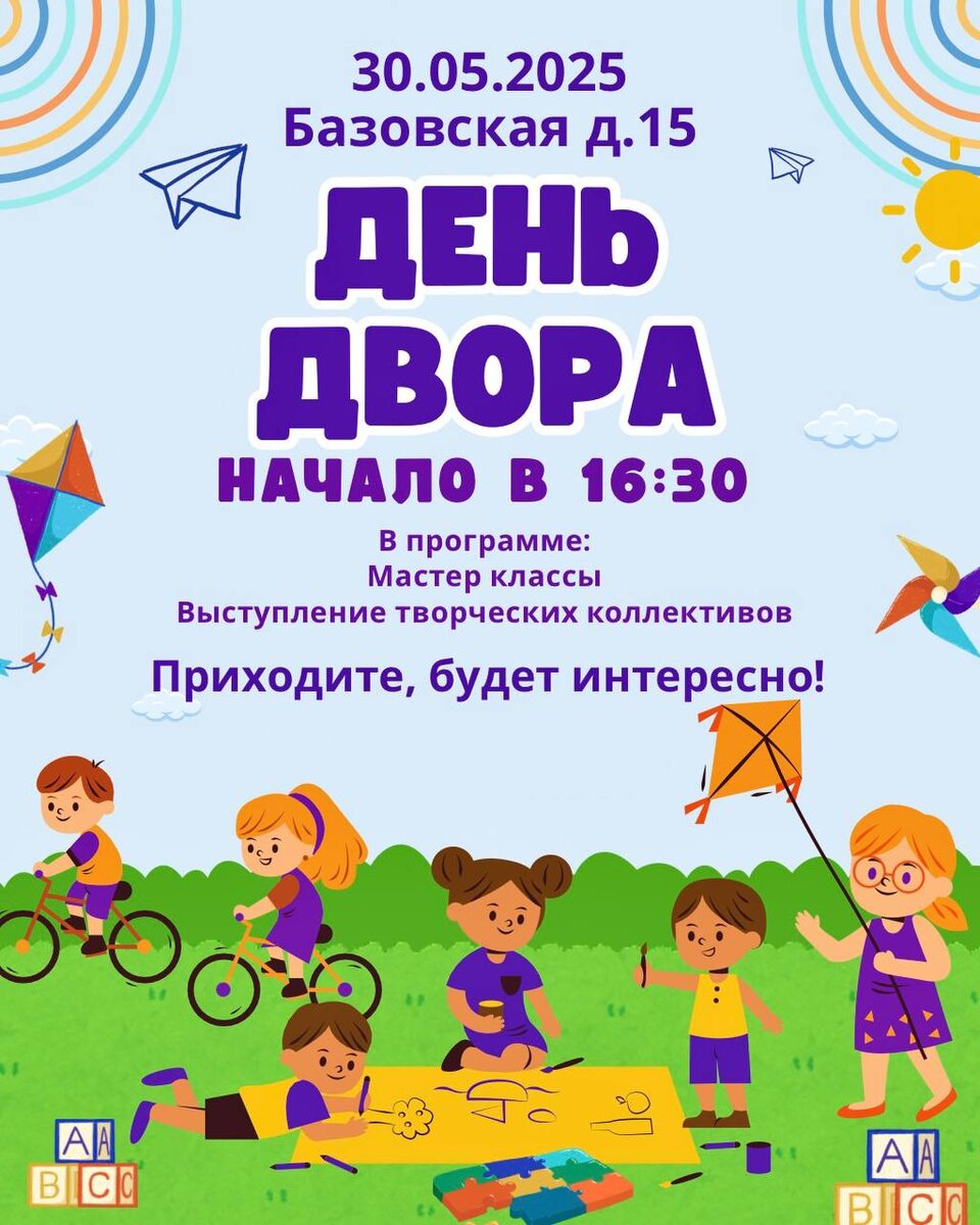 Приглашаем вас на День двора! 📅 Дата: 30 мая 2025 года 📍 Место: ул. Базовская, д. 15 🕓 Начало: 16:30 В программе: ✨ Мастер-классы для всех желающих 🎶 Выступления творческих коллективов 🎉 Развлекательные мероприятия для детей и взрослых Приходите, будет интересно и весело! Мы ждем вас 💜