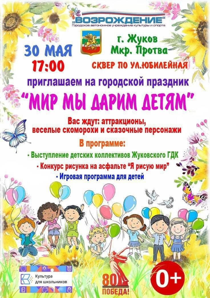 🎈 Дорогие мальчишки и девчонки, а также уважаемые родители! Приглашаем вас на городской праздник «Мир мы дарим детям» 30 мая в 17:00 г. Жуков, мкр-н Протва, сквер на улице Юбилейной👍 🔥 В программе вас ждут яркие выступления детских коллективов Жуковского ГДК, конкурс рисунков на асфальте и увлекательные игровые мероприятия для детей. Не упустите возможность провести время с пользой и удовольствием! Мы вас ждем! 💯 #Жуковскийрайон40