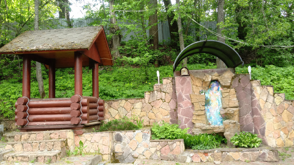 Как я и обещала, продолжение следует). В 2008 году на крутом берегу реки Горетовки, неподалеку от церкви, появилась смотровая площадка с источником и купальней, освященной в честь преподобного Иосифа Волоцкого. Особенно много верующих приходит сюда на праздник Крещения Господня.. В 2004 году при Середниковском храме открылась приходская иконописная школа-мастерская. Один из ее художников создал живописное панно «Хрустальный Ангел», украсив им источник. Источник и купальня преподобного Иосифа Волоцкого Мы так и не смогли понять, как попасть внутрь. Когда мы подошли, в дверях торчал ключ, а из помещения доносились женские голоса. Рядом стояли велосипеды. Мы не стали мешать им. Но после их ухода все уже было закрыто. Вероятно, ключи следует искать в храме. Источник - громко сказано . Может конечно так и задумано ,но тогда надо и в картах к месту прикреплять информацию , о том что источник работает по какому то принципу не для всех . Т.е. когда мы стали осматривать колодец - закрыт на з