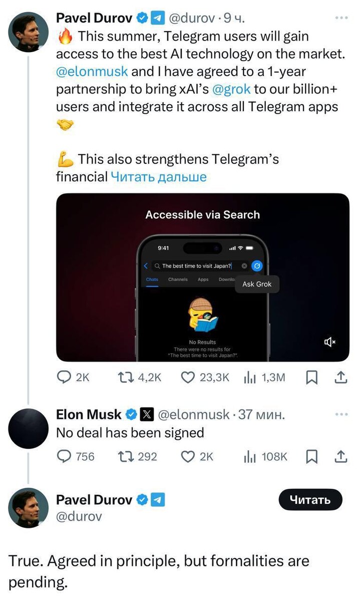 Происходит что-то мутное. Ещё вчера Павел Дуров опубликовал пост о грядущей глубокой интеграции Grok в Telegram. Подробности читайте в предыдущем посте.