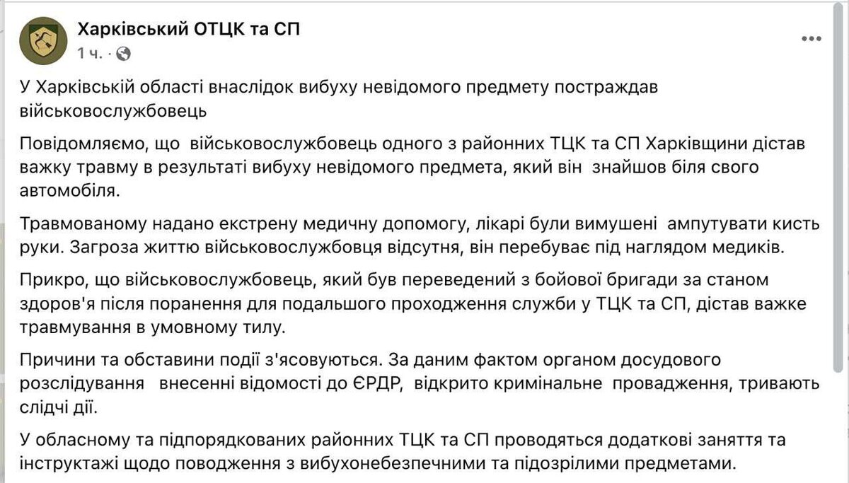 В Харькове подорвали военнослужащего ТЦК, ему оторвало руку