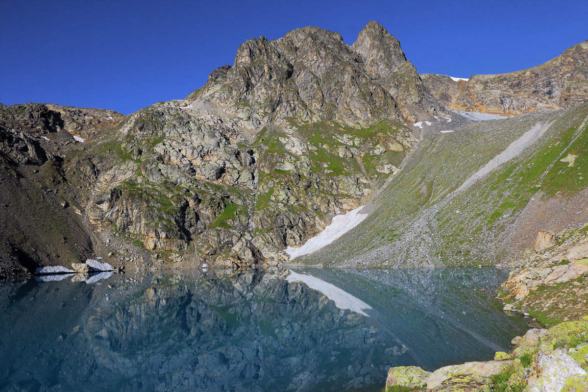 Ночь прошла спокойно. В отличии от 2013-го года туры в гости не пришли. Поэтому спали все хорошо и спокойно. Утро обещало отличную погоду. Пока ребята готовили завтрак и собирались я «занялся» снова Большим Софийским озером. Сборы были не долги. Еще вечером Оля решила полежать в лагере, т.к. она слегка растерла ногу и к перевалу Караджаш мы стартовали впятером. Довольно быстро перескочили через небольшую перемычку в скалах в соседнее ущелье и пройдя снежник, мы по крутой осыпной тропе полезли на перевал. Озеро, именуемое "Верхней запятой", хотя в оригинале оно именуется Айматлы Джагалы. Массив Караджаш В процессе выползания на перевал мы были не одиноки. И перед нами и за нами наверх ползли другие группы. На перевале мы не стали задерживаться и свернув налево, по скальному гребню начали подниматься на вершину Миген-Кёль-Баши. Естественно, фотоаппарат не сильно отдыхал, "снимая" виды и панорамы. Ребята очень хотели увидеть Эльбрус. Но я проявил пессимизм и развеял их мечты. Но ка