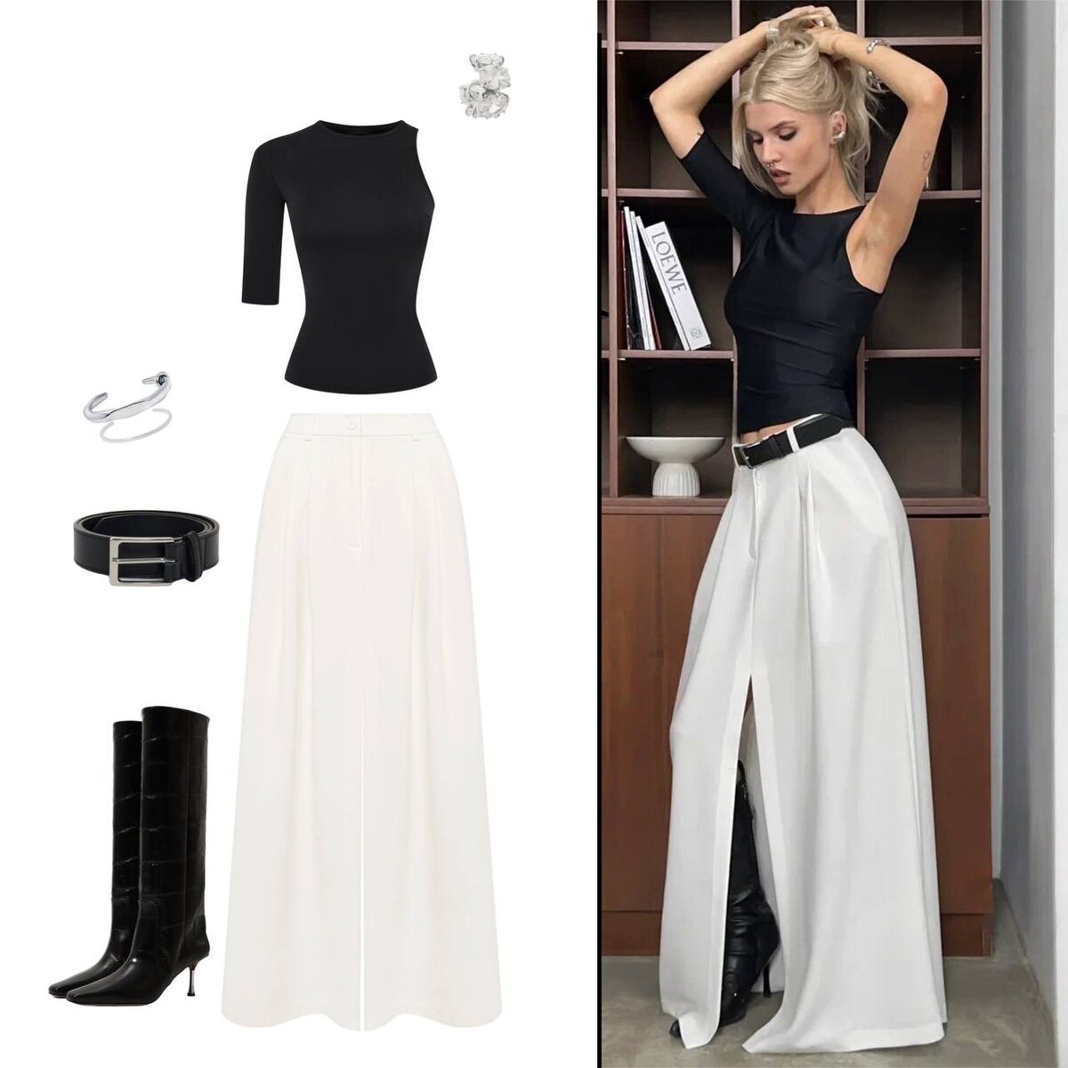 LOOK OF THE DAY Белая юбка-макси с имитацией брюк — свежий взгляд на классику. Свободный крой и мягкий оттенок создают ощущение лёгкости и свободы. Чёрный асимметричный топ подчёркивает фигуру и добавляет графичности. Акценты: лаковые сапоги, ремень с чёткой пряжкой и минималистичные украшения. you-wanna.ru / мобильное приложение App Store и Google Play / офлайн магазины