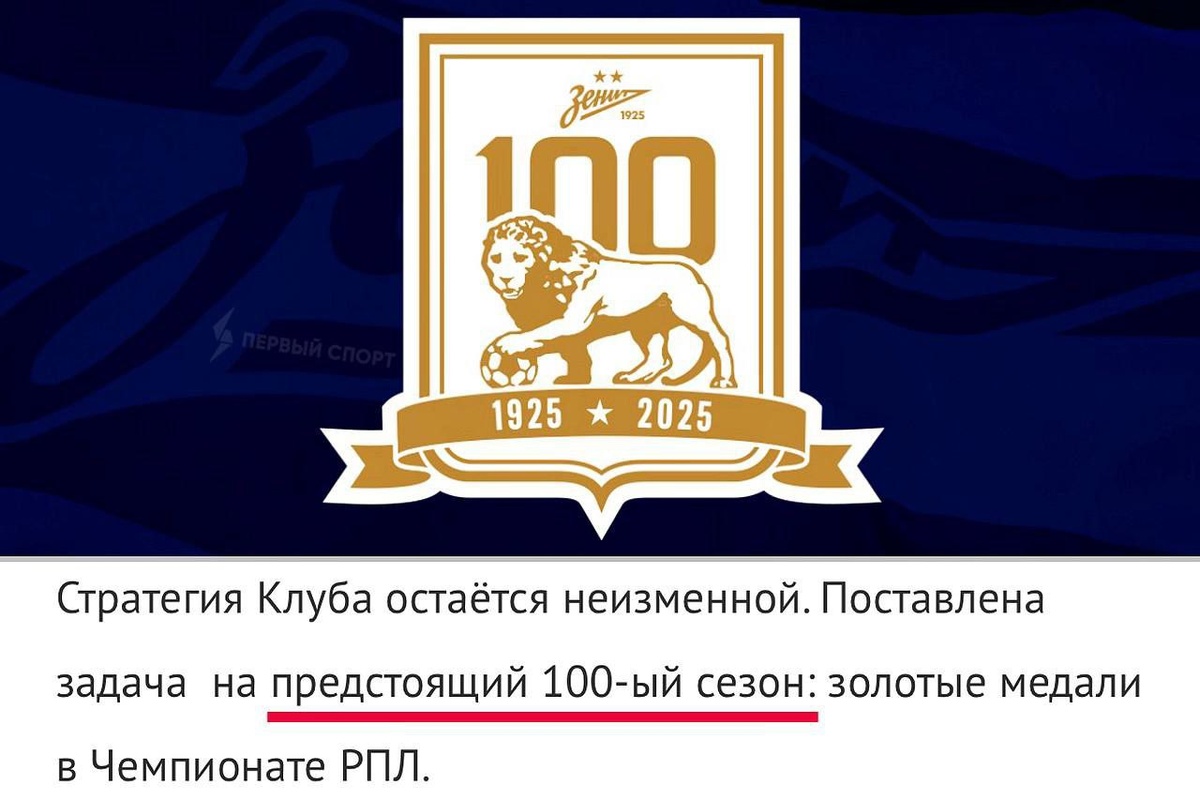 «Зенит» официально «перенёс» столетие на следующий сезон: на сайте петербуржцев сказано, что именно в РПЛ-2025/26 будет «100-й сезон» клуба – в нём поставлена задача выиграть золото. Семак, Медведев, весь тренерский штаб и менеджмент остаются в клубе. Таким образом, минувший сезон, в котором чемпионом стал «Краснодар», был 99-м для «Зенита»