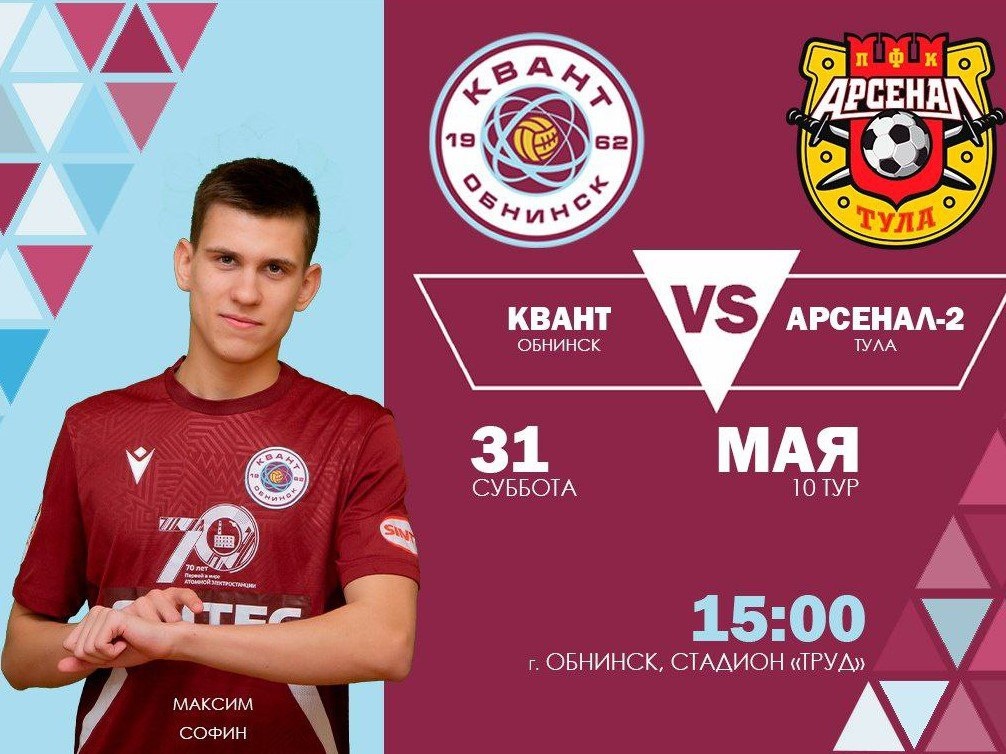 ⚽31 мая в 15:00 на стадионе «Труд» в Обнинске состоится футбольный матч — ф/к «Квант» (Обнинск) vs «Арсенал-2» (Тула