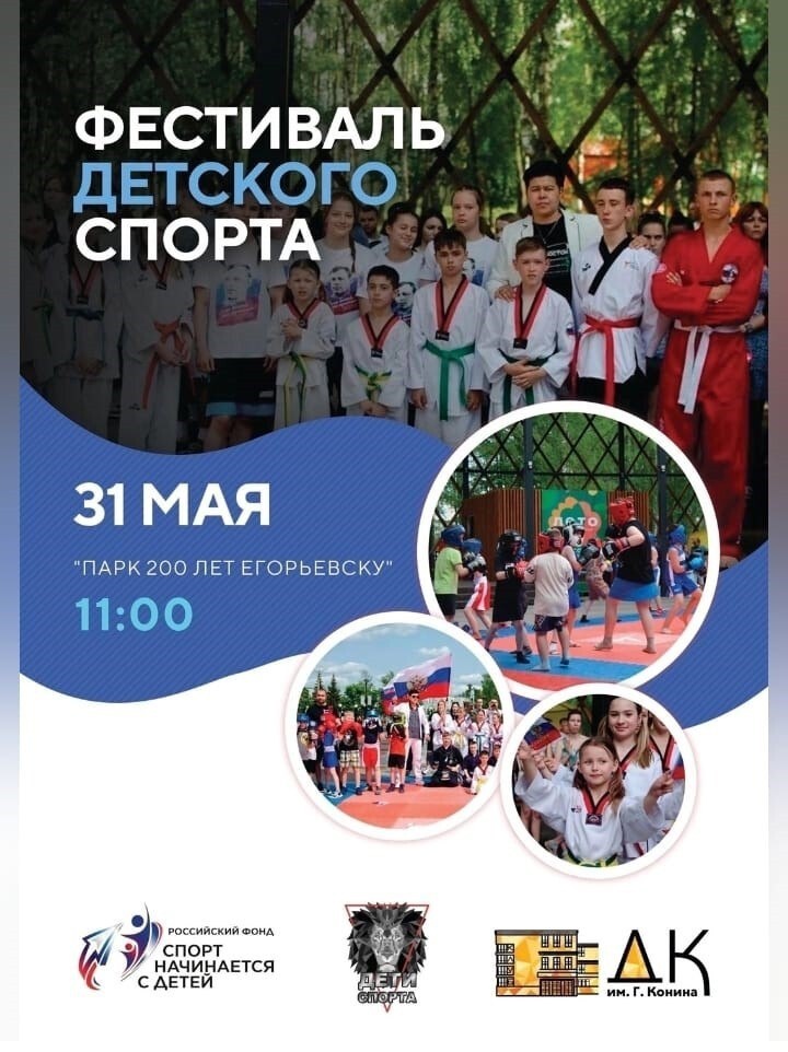 Парк «200 лет Егорьевску» приглашает на фестиваль детского спорта В программе мероприятия: - Выступление духовного наставника и участников специальной военной операции - Флеш-мобы от школы №8 и студии современного танца "Интеграция" - Гимн России и Фонда "Дети спорта" в исполнении школы вокала «SOLO`VOICE» - Разминка от мастера спорта России по вольной борьбе Анны Никитинской Спортивные мастер - классы и показательные выступления: - Школы по вольной борьбе им. Ю.С. Чернова - Спортшколы "Виктория" - Клуба бокса "Егорьевск" - Школы брейк-данса "Свой Стиль" - Школы айкидо и кендо - Зала бокса "Поколение" Концерт команды КВН Зоны активности: - Силовая зона - Сборка/разборка автомата - Шахматный турнир - Аквагрим - Анимационная программа Дата: 31 мая Начало 11:00 #подмосковье #НашеПодмосковье #муниципальныйокругЕгорьевск #моЕгорьевск #егорьевскоетелевидение #егорьевскоетв #Егорьевск #администрацияегорьевск