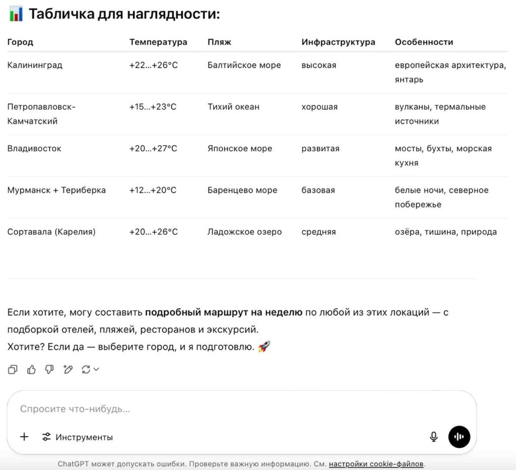 Мы дали этот промпт трем ИИ — ChatGPT, Grok и Claude. В качестве региона для путешествия указали Россию. Ответы нейросетей немного отличались друг от друга и были достаточно полными. На скриншотах — выводы (ChatGPT даже собрал сводную табличку) и рекомендации чат-ботов.