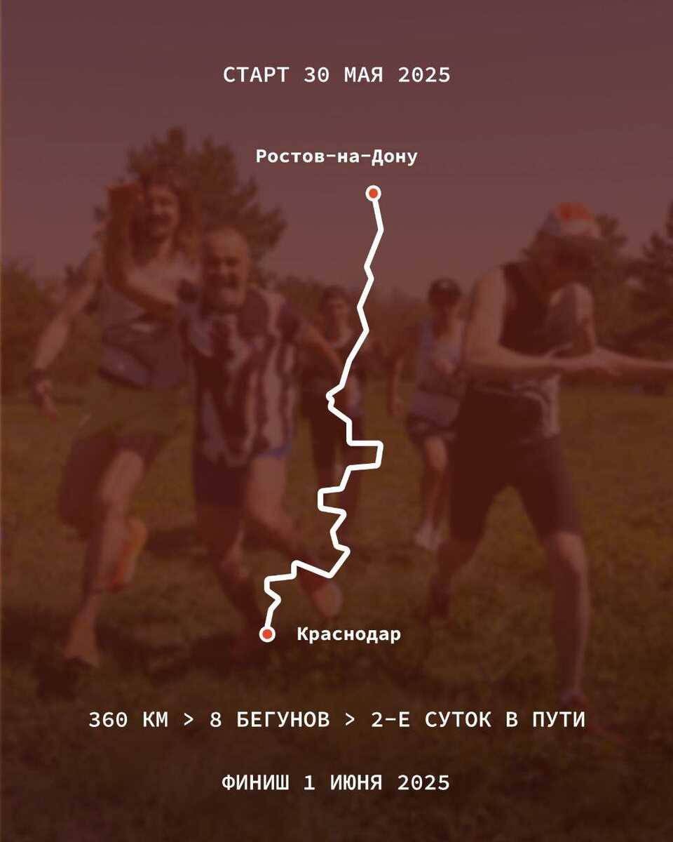 Восемь человек добегут от Ростова до Краснодара в рамках беспрецедентного на юге России ультрамарафона. Вечером 30 мая, в 19:00, группа из восьми самых выносливых атлетов стартует от улицы Социалистической, 145 в Ростове и отправится на своих двоих в столицу Кубани. Их конечной остановкой будет дом на улице Домбайской, 55 (корпус 3) в Краснодаре. Маршрут поделили на отрезки, которые спортсмены будут преодолевать по очереди. Их разделили на пары: пока один из пары будет бежать, второго отвезут к месту его следующего старта на машине. В среднем каждый из них пробежит порядка 90 километров. На забег дается меньше двух суток: его планируют завершить к 09:00 1 июня. Ультрамарафон повторяет аналогичную пробежку, которую спортсмены устроили из Екатеринбурга в Пермь. На юге России такой формат забега станет беспрецедентным. Цель акции — привлечь внимание к донорству костного мозга. 👉🏻Новости №1 в Ростове 💌Прислать новость/фото