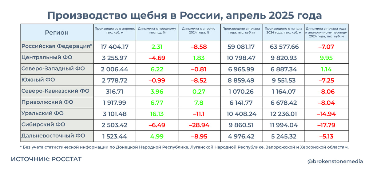 Росстат опубликовал данные по производству щебня в апреле 2025 года. За месяц в России получено 17,4 млн куб. м (24,4 млн тонн). По отношению к апрелю 2024 года производство щебня по стране упало на 8,6%. Положительную динамику показали только Приволжский (7,8%), Центральный (1,8%) и Северо-Кавказский (0,3%) федеральные округа. Все остальные регионы продемонстрировали падение производства к апрелю прошлого года, причём наиболее сильное снижение зафиксировано на предприятиях в Сибирском (–28,9%) и Уральском (–11,1%) федеральных округах. Наибольшие объемы щебня в апреле 2025 года произвели предприятия Центрального и Уральского федеральных округов. Уральский федеральный округ показал лучшие результаты роста выработки по отношению к прошлому месяцу — 16%. Худшие показатели к прошлому месяцу показали Сибирский и Центральный федеральные округа: –6,5% и –5% соответственно. С начала 2025 года в стране произведено 59,1 млн куб. м (82,7 млн тонн), что на 7% меньше, чем за аналогичный период про