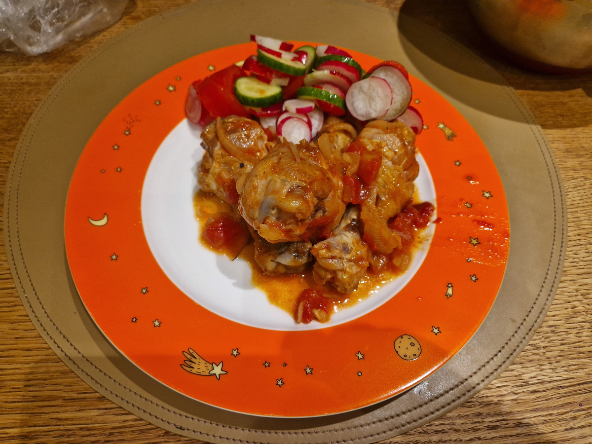 Ингредиенты: В глубокой сковороде растапливаем сливочное масло. я для готовки использую масло гхи. Кладем на сковороду курицу. Такое количество я обжаривал в 2 этапа. Обжариваем курочку до золотистой корочки ~5-7 минут с каждой стороны на сильном огне. Курицу вынимаем со сковороды. В оставшееся от жарки масло кладем нарезанный средними кубиками лук. Обжариваем, помешивая, до золотистого цвета ~ 5 минут. Добавляем в сковороду резаные томаты в собственном соку. Тушим на среднем огне ~15 минут, периодически помешивая. Добавляем соль, перец по вкусу, специи. Перемешиваем, тушим еще 5 минут. Добавляем к овощам курицу. Тушим под крышкой на среднем огне еще ~15 минут до готовности курицы. Курица готова. ПРИЯТНОГО АППЕТИТА!