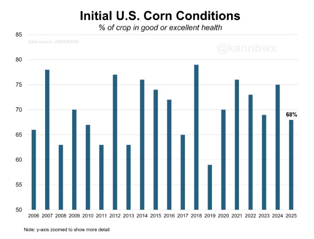 68% GE — это не так плохо. В среднем за последние три года начальная оценка урожая кукурузы в США составляла около 72%. Кроме того, более медленный старт может быть связан с неблагоприятными погодными условиями.