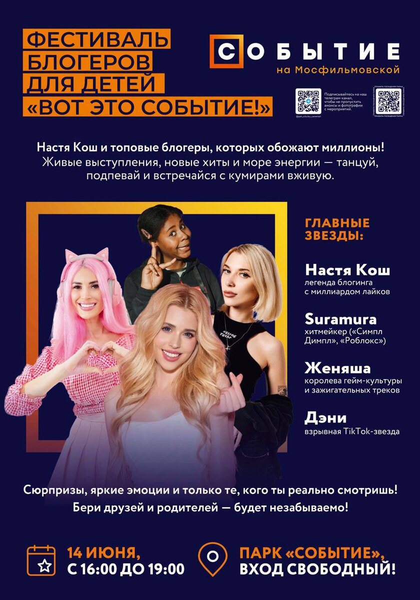 🎉Москва, я еду к вам! 🎉 Концерт блогеров для детей "ВОТ ЭТО СОБЫТИЕ!" 😍Ваши любимые блогеры: Женяша, Настя Кош, Suramura, Дэни и другие! 📅 14 Июня ⏰ Время:16:00 – 19:00 📍 Место:Парк "Событие" 🎟 Вход: Свободный! ✨Бери друзей – будет незабываемо! 💕