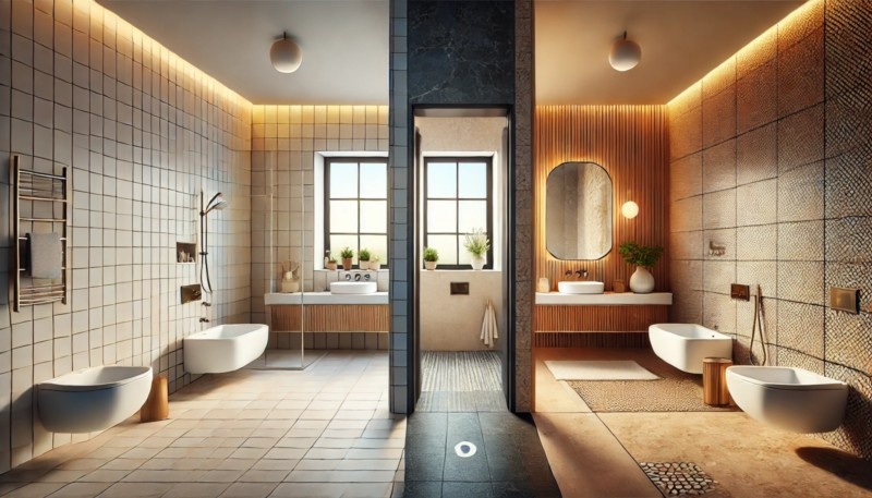Если говорить об отделке пола и стен, то керамогранит остаётся абсолютным фаворитом. Он не боится воды, перепадов температуры и служит десятилетиями. Для ванных особенно актуальны варианты с антискользящим покрытием: они безопасны даже в мокром состоянии. Кроме того, керамогранит может быть не только холодным на ощупь — есть варианты с шероховатой или бархатистой поверхностью, которые приятны ногам.