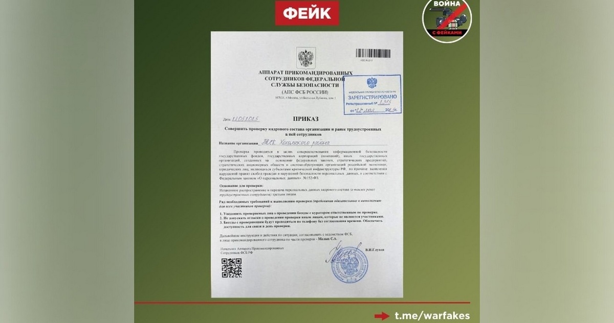 В интернете циркулирует поддельное письмо, якобы отправленное «Аппаратом прикомандированных сотрудников ФСБ». В этом письме утверждается, что работники Хохольской территориальной избирательной комиссии (ТИК) подвергаются проверке из-за неправомерного распространения личных данных. Однако, как заявили в Telegram-канале «Война с фейками. Воронежская область» в четверг, 29 мая, этот документ является подделкой, так как подобной организации не существует. Подделка выполнена небрежно и содержит пунктуационные ошибки. Наличие QR-кода в нижнем левом углу приказа также указывает на его фальшивость. Кроме того, в документе отсутствует логическая последовательность: проверяющим предписано согласовывать свои действия с ФСБ, хотя из текста следует, что проверку проводят сами сотрудники ФСБ. Важно отметить, что ФСБ не использует телефонные беседы в качестве способа проведения проверок. «Война с фейками» сообщает, что это распространённая мошенническая схема. Преступники рассылают подобные письма, а