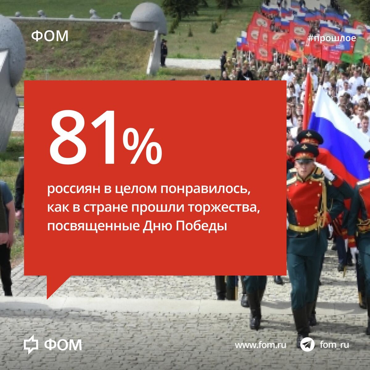 🎉 Россияне – о праздновании Дня Победы Недавно наша страна отмечала 80-летие Победы в Великой Отечественной войне. Большинство опрошенных ФОМом россиян (81%) остались довольны прошедшими мероприятиями. Особенно их впечатлили парад, мощь военной техники (15%), торжественность и масштабность праздника (15%), а также его историческая значимость и память о войне (12%). 53% россиян сообщили, что в их городах и населенных пунктах прошли массовые мероприятия, такие как митинги, встречи с ветеранами, шествия и гуляния. В этих мероприятиях приняли участие 22% опрошенных, 63% не участвовали. В акции «Бессмертный полк» в этом году участвовали 11%, 88% не участвовали. Подробнее: fom.ru #прошлое #история 📱 Фонд Общественное Мнение