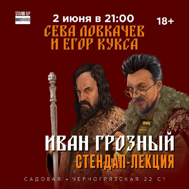 Стендап-лекция Егора Куксы и Севы Ловкачева в Brothers 📚 Тема: Иван Грозный Всё, что вы хотели или не хотели знать про одного из самых противоречивых правителей России. Лекция, на которой можно смеяться не только за последней партой. 🎟️ Билеты по 800р уже в продаже